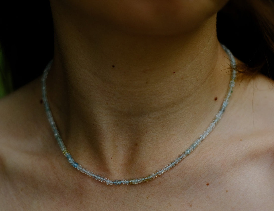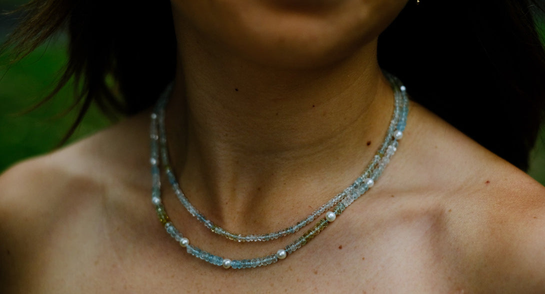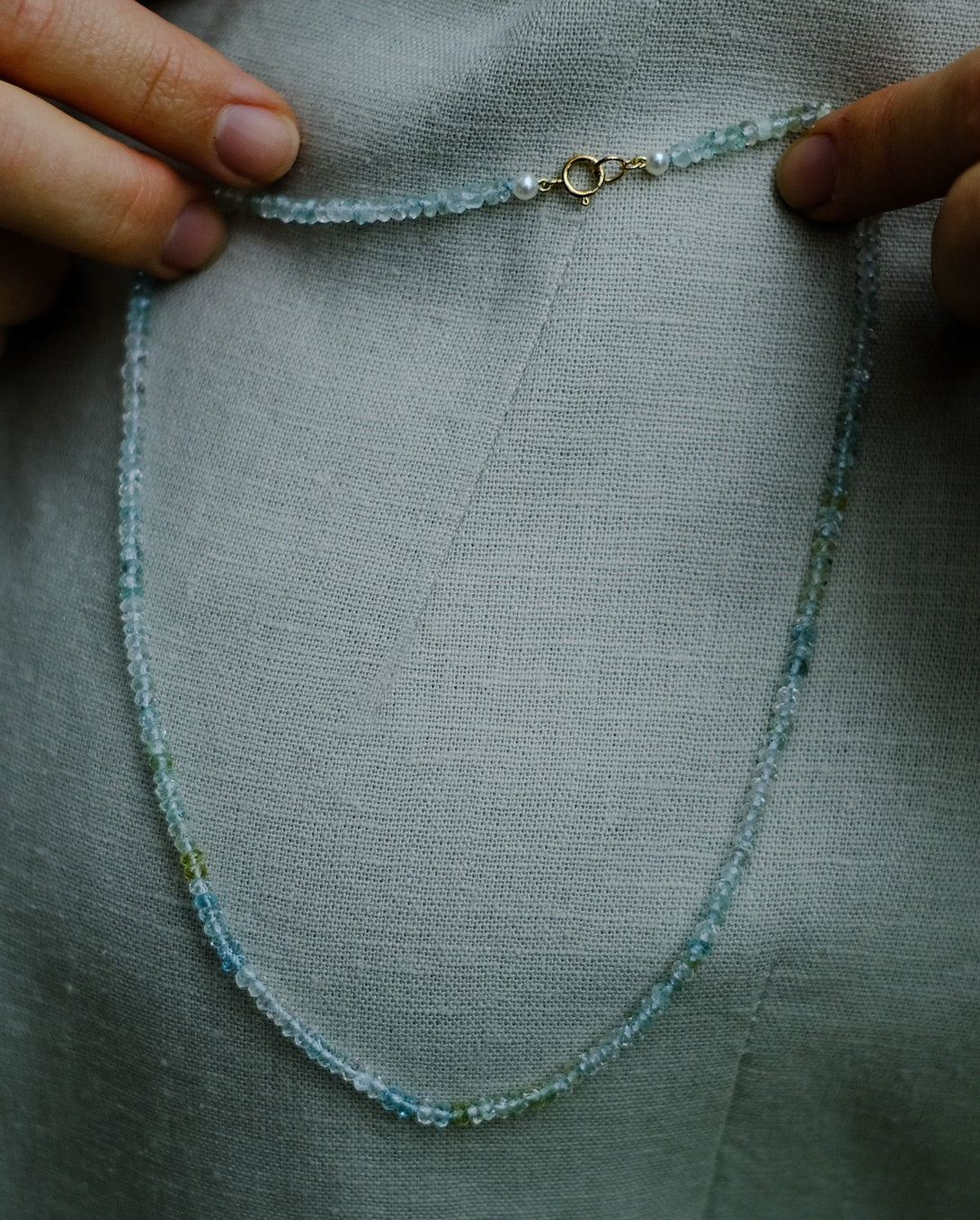 Stunning Aquamarine Necklace. Handmade and strung on Silk Blue Thread. Freshwater Pearl details at the clasp.