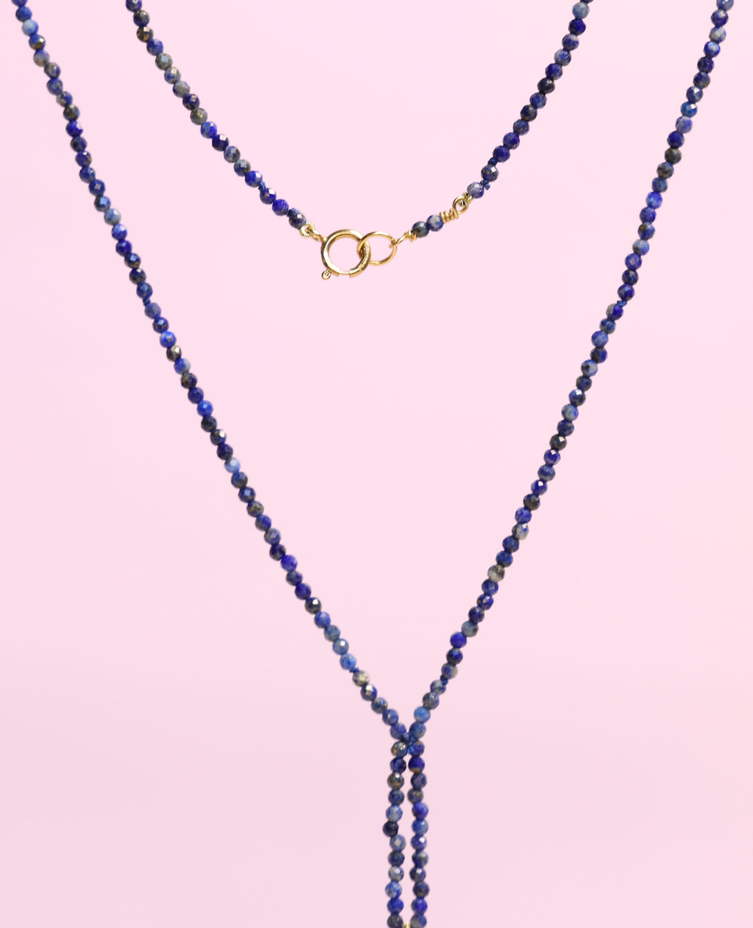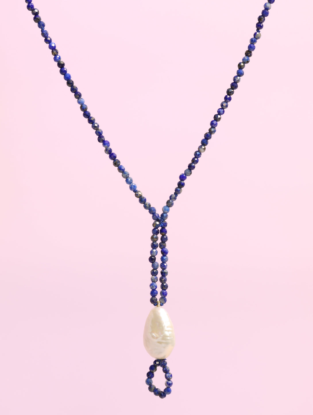 Petra Necklace handmade featuring machine cut Lapis Lazuli and strung on a silk thread. Fixed Lariat Style with a Penny Teardrop Freshwater Pearl and lapis teardrop detail.